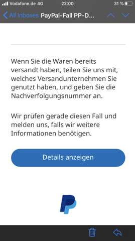 Verwenden Sie eine nachverfolgbare Lieferung mit einem unserer zugelassenen Lieferunternehmen und geben Sie die Verfolgungsdetails auf Ihrer PayPal-Aktivitäten-Seite ein. Sie sollten damit also. Sollte der Antrag erfolgreich durchgeführt werden erhalten Sie ihr Geld inklusive Versandkosten zurück.